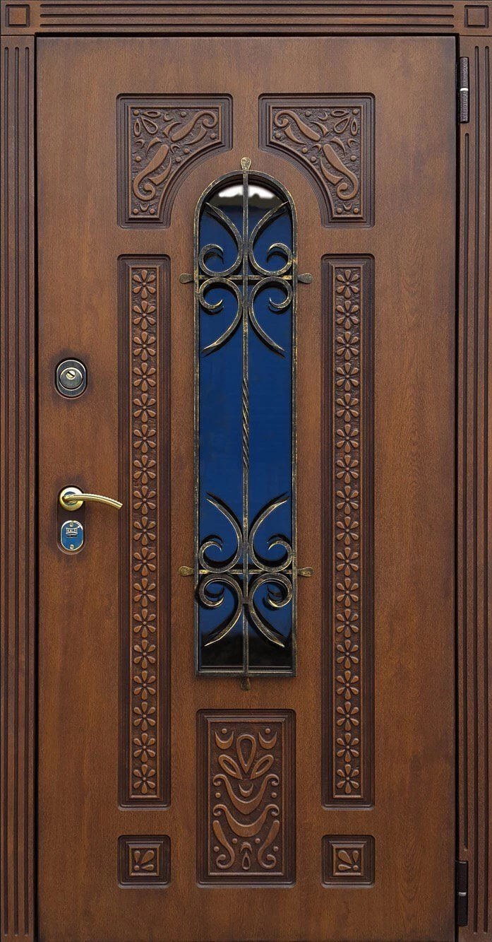 Входные двери в Сарапуле с применением декора витражом изготавливаются из стального профиля, придающего прочность конструкции, а сама витражная вставка обладает высокой взломостойкостью, поскольку для витражных композиций используется специальное стекло, обработанное особым образом. Усилить надежность витражного элемента можно с помощью использования декоративных кованных решеток.