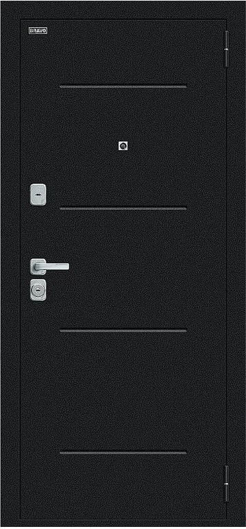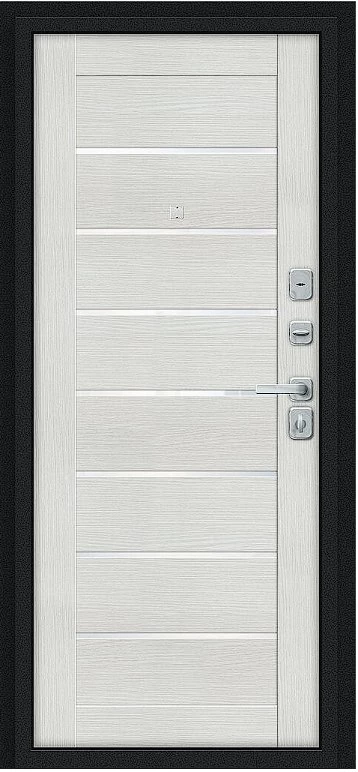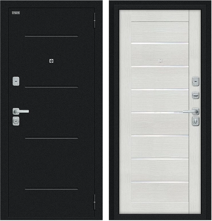 Надежная входная Дверь Браво Техно/BChrome Букле черное/Bianco Melinga премиум класса по цене 34 747 руб. Большая толщина стали защитит от проникновения в ваш дом, квартиру или коттедж. Используется очень качественная фурнитура: замки, цилиндры, ручки, защелки. Покрытие и отделка двери изготовлено под внимательным контролем производителя. Дверь имеет долгий срок службы и гарантию.